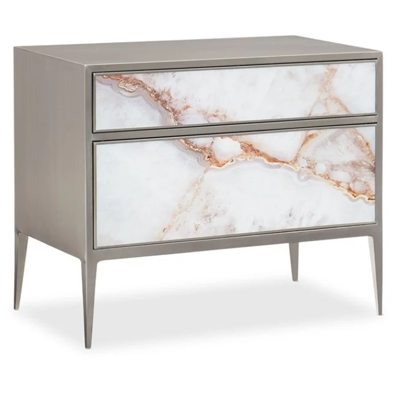 When it comes to an inspired design choice, this chest is A Real Gem. Its distinctive look draws upon the beauty of natural stone’s perfectly imperfect shapes and forms. Each of its two glass drawer fronts feature an exquisitely painted agate pattern that brings the beauty of the outdoors to the inside. A clean-lined, understated metal frame allows the beauty of the agate pattern to enjoy the limelight while slim, tapered legs complete the look.