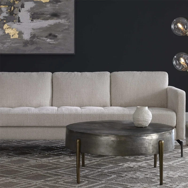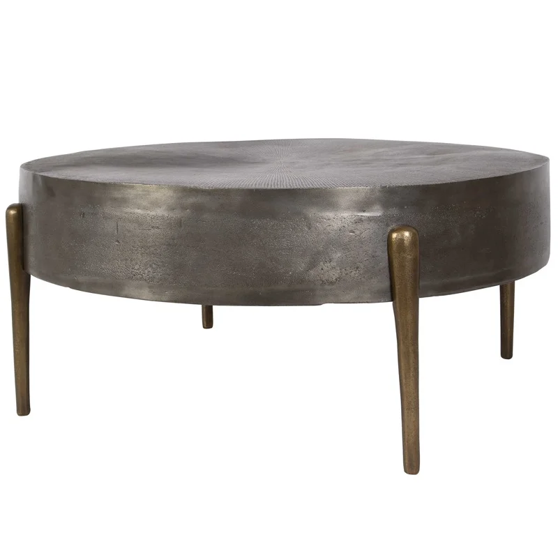 A modern mix of cast aluminum, featuring a radial textured top in oxidized gunmetal paired with round tapered legs finished in antique brass.