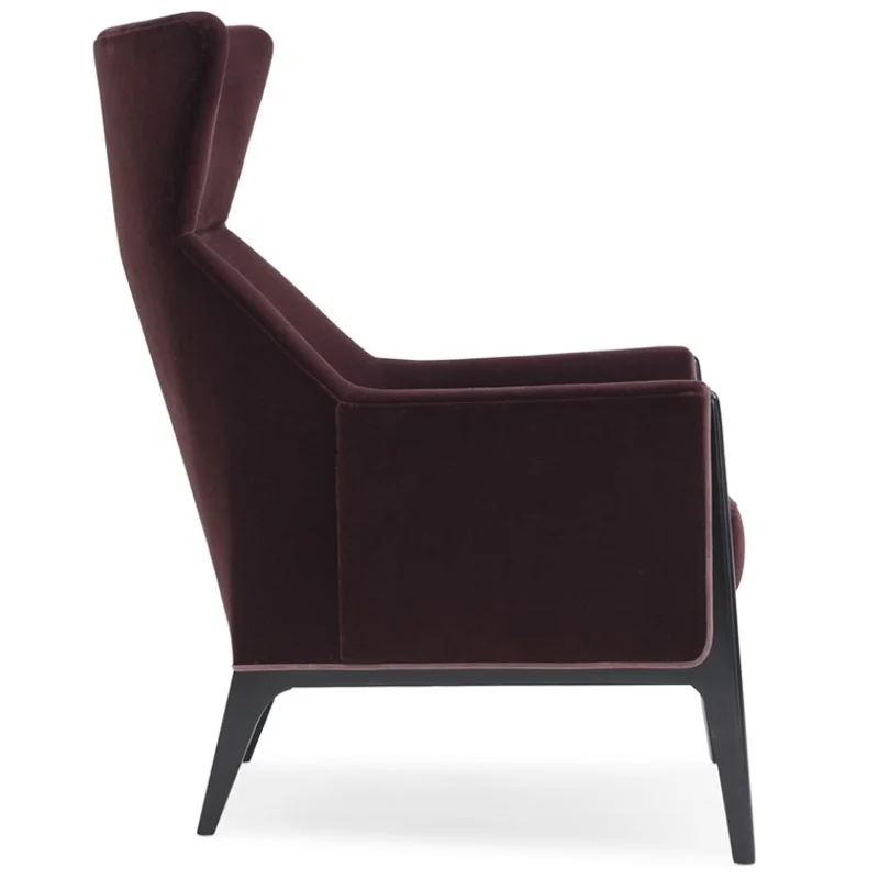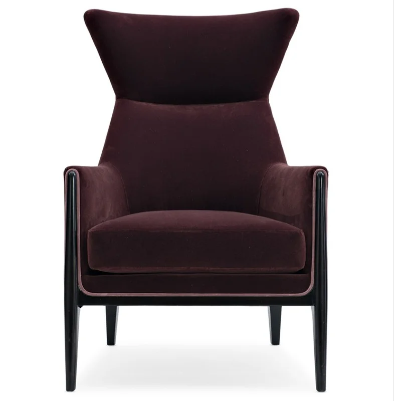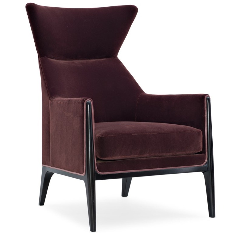 Featuring style that knows no boundaries, this unique chair is rich in color, material and presence. It represents an artist’s interpretation of the classic wing chair and is destined to shine in any setting. Its bold mo-velvet cover is featured in a rich shade of eggplant that shimmers and shines when it catches the light. A coordinating amethyst velvet welt adds another layer of distinction and is complemented with a Satin Ebony finish on the chair’s wood trim. With the power to instantly modernize a space, this distinctive chair works beautifully on its own or as a pair across from a sofa or fireplace.