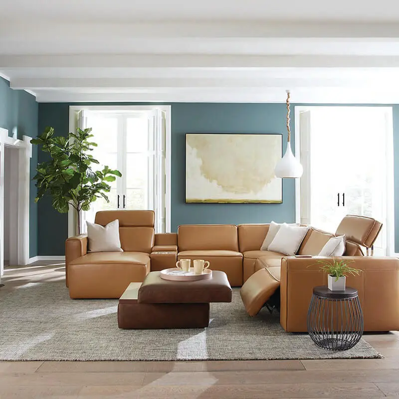 A contemporary clean look. Low to the ground lines and reclining power seats that provide ultimate comfort. A full chaise power footrest is adjustable and will support your legs as the power headrest invites you to lean back and relax. Customize & configure this piece with our designers to fit your space! Available in different cover options in both leather & fabric.
