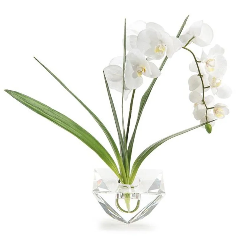 A diamond-cut crystal vase holds a white phalaenopsis orchid and foliage in faux water.