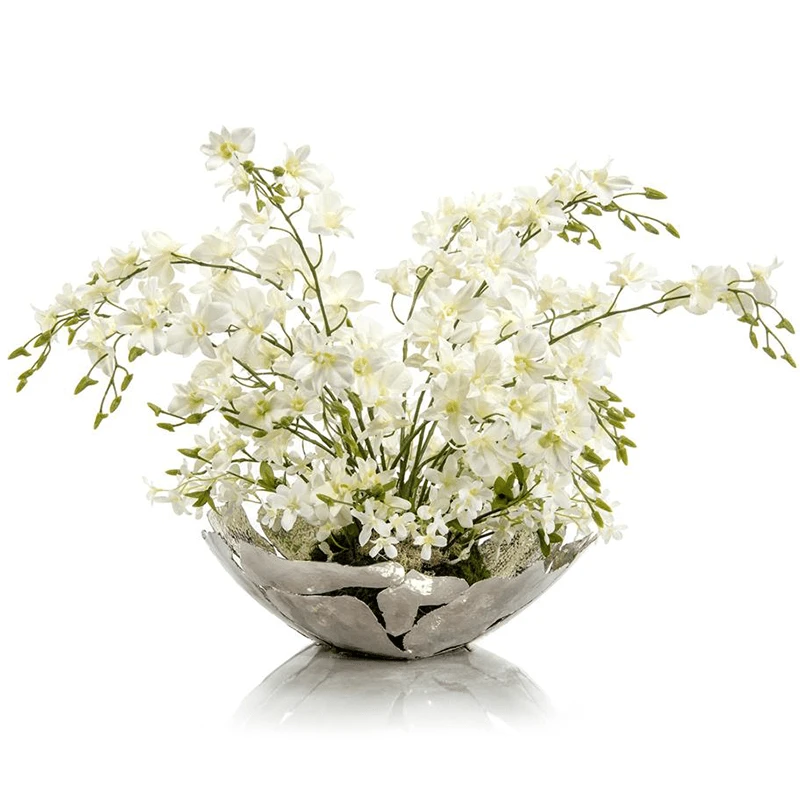 Preserved Dendrobium flowers and apple blossoms in an open and airy arrangement in a beautiful nickel finished bowl.