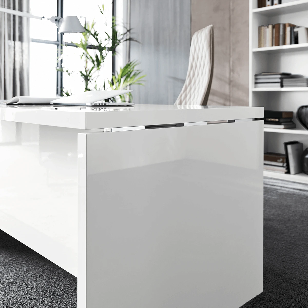 The Sedona office desk is a radiant new look, which compliments any home or work space. A white high gloss finish gives the desk a remarkable, modern touch. Combine this unit with the return to create an exclusive desk. The Sedona collection offers a variety of furniture pieces to complement your ideal office space. The collection includes a library bookcase, along with small and large filing cabinets and credenza storage.