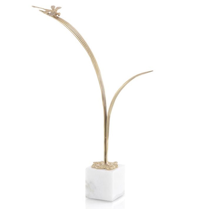 An intricately cast dragonfly is perched on a lemongrass leaf that is mounted on an alabaster base.