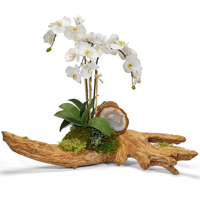 Phalaenopsis orchids balanced on a beautiful piece of unique driftwood. Embellished with agate slabs, succulents, and soft supple preserved moss.