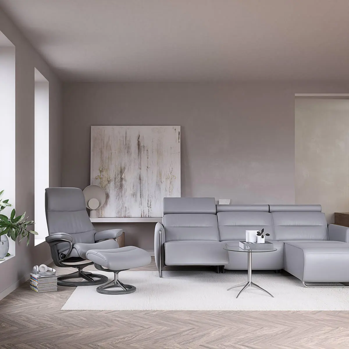 Sleek lines with a modern look give Stressless Emily an embracing appearance. The contemporary design of the soft enveloping cushions invite you to sit down and relax. All seat modules come with an adjustable headrest. Either with fixed seat-back or fitted with motors for personal adjustment of back and leg support. Choose between either steel or wood details on the armrest. The recliners Stressless Tokyo and Stressless View both couples up nicely with the Stressless Emily sofa.