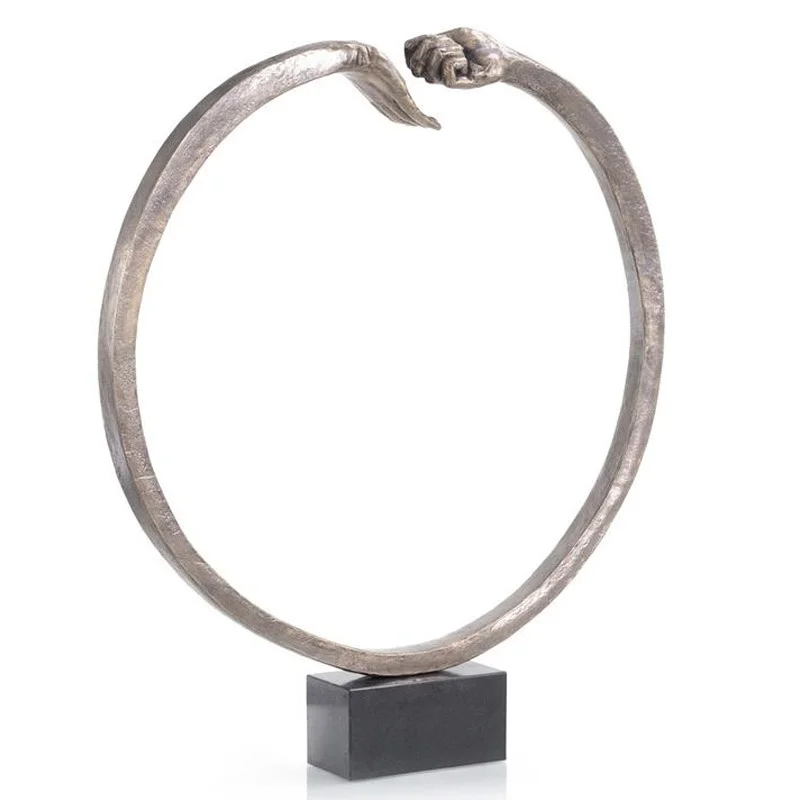 This monumental sculpture features two hands sweeping together in eternity. The hands are in a finish of aged silver, and they are mounted on a black marble base.