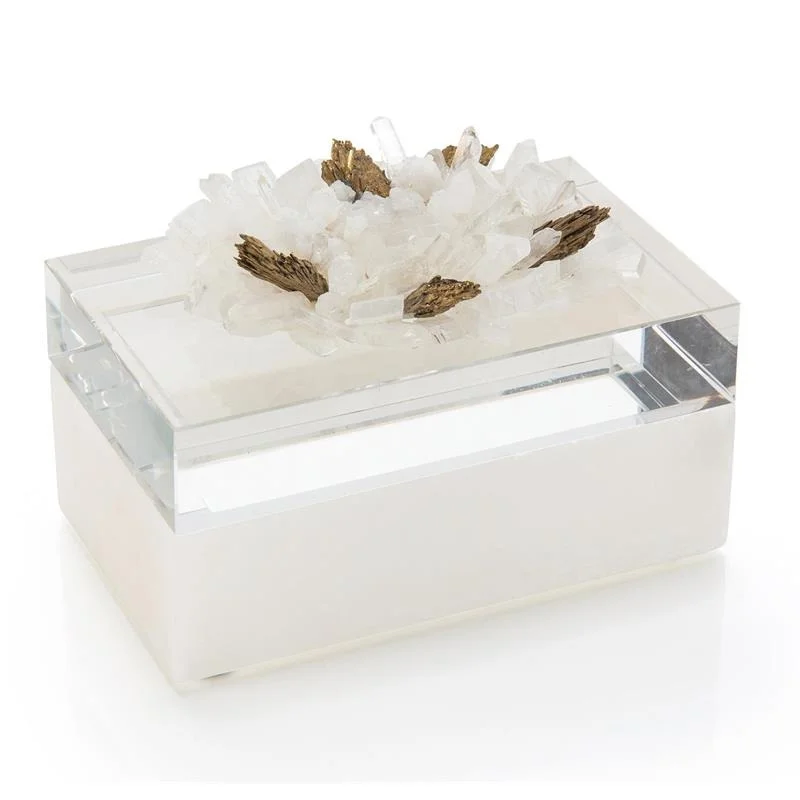 An amazing collection of quartz crystals, tourmaline, and calcite adorns the crystal lid of this lovely alabaster box.