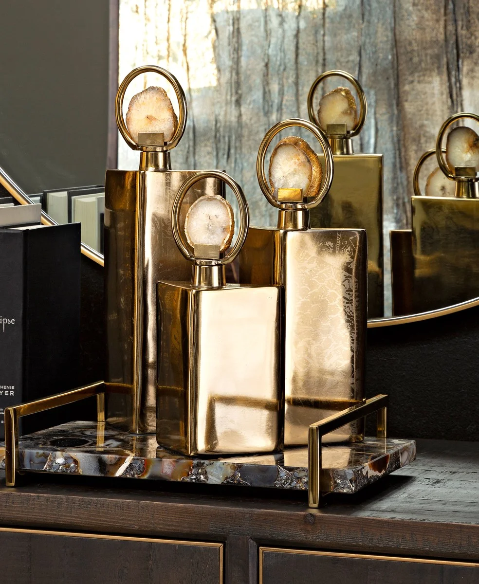 Featuring triangular bodies crafted in aluminum with a gleaming gold finish and stoppers adorned with slices of agate marble, this set of three bottles exudes the look of luxury. Place them on a vanity or tabletop for an attractive display in any room.