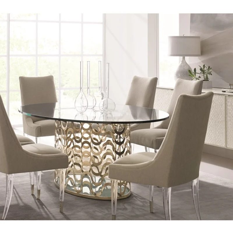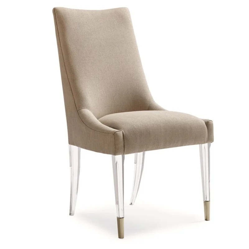 Settle into the soft curve of the upholstered back and seat of this oh-so-comfortable dining chair. This tall, sling-back chair is upholstered in a woven taupe linen fabric that offers a neutral palette to easily mix into any decor. You and your guests can float thru dinner suspended on thin, clear acrylic legs accented with Whisper of Gold metal ferrules. This chair is a natural selection for rooms that need a breath of fresh air.