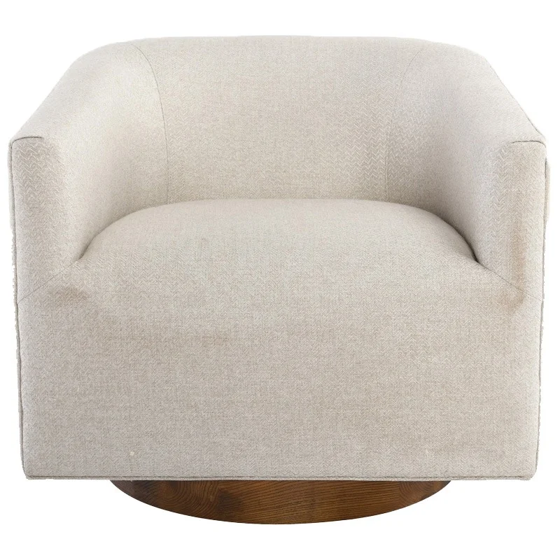 A chic, contemporary look into any setting with this accent chair featuring neutral beige upholstery, smooth swivel action, and a contrasting oak wood base.