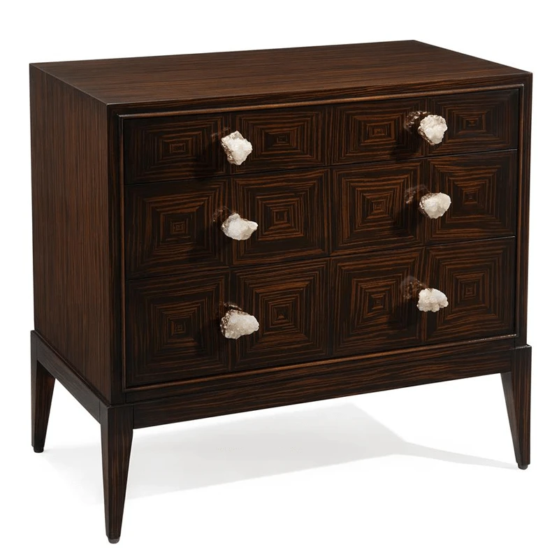 Each of the three graduated drawer fronts are veneered in ebony with a linear pattern of four squares, and they feature silvered crystal handles. The carcass is also veneered in ebony.