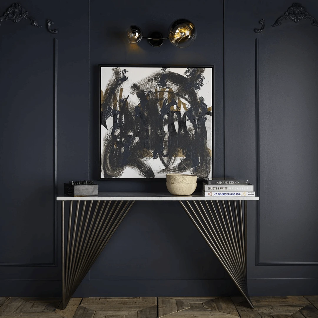 Ornament a hallway with the Marcel Console Table, a strongly angled statement piece featuring a smooth stone top set atop a bronze metal finished base.