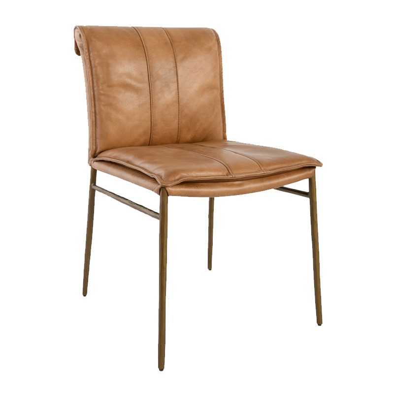 This minimalist dining chair features supple tan leather upholstery and hammered iron legs.