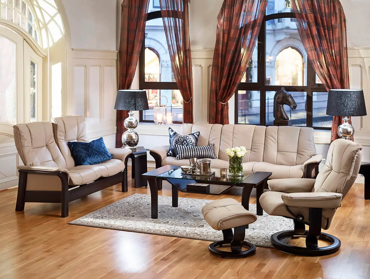 Elegant and laidback, the Stressless Mayfair has the classic Stressless look. Its cushioning is extra supple and comfortable, and contributes to making this one of our top sellers. A classic look bursting with state-of-the-art comfort technology makes this an excellent representative of the renowned Stressless comfort. Two features of the Stressless have contributed most to garner the support of the American Chiropractic Association. The PlusTM System moves the headrest slightly forward as the chair glides back, allowing for easy reading, television watching or net surfing. Then, with a quick snap of the headrest, it lies flat for maximum relaxation. In addition, the Stressless incorporates a lumbar support system that matches the changing contours of one’s lumbar area. As the chair glides to recline, the lumbar area curves outward to offer continual support of the lower back area.