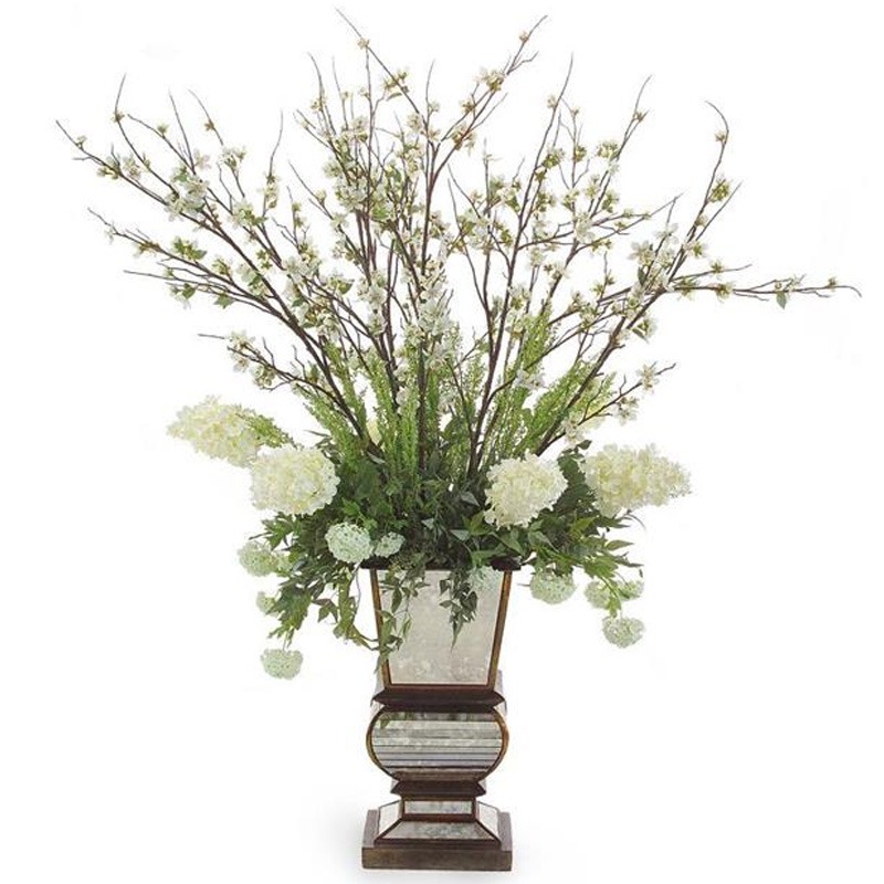 A classic urn is filled with apple blossoms, fluffy cone hydrangeas, snowballs, and nandinas.