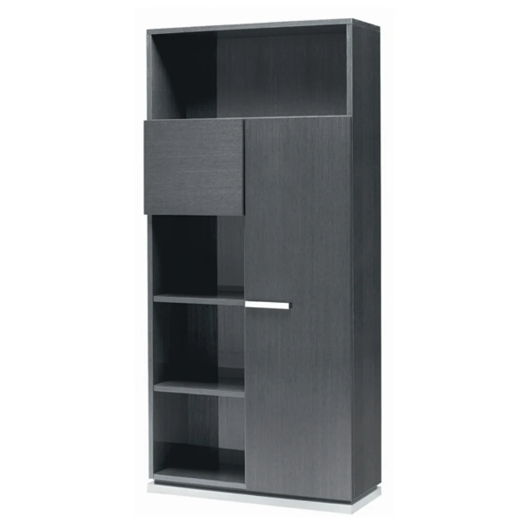 4 shelves, one small cabinet, large cabinet with shelves. Chrome accents