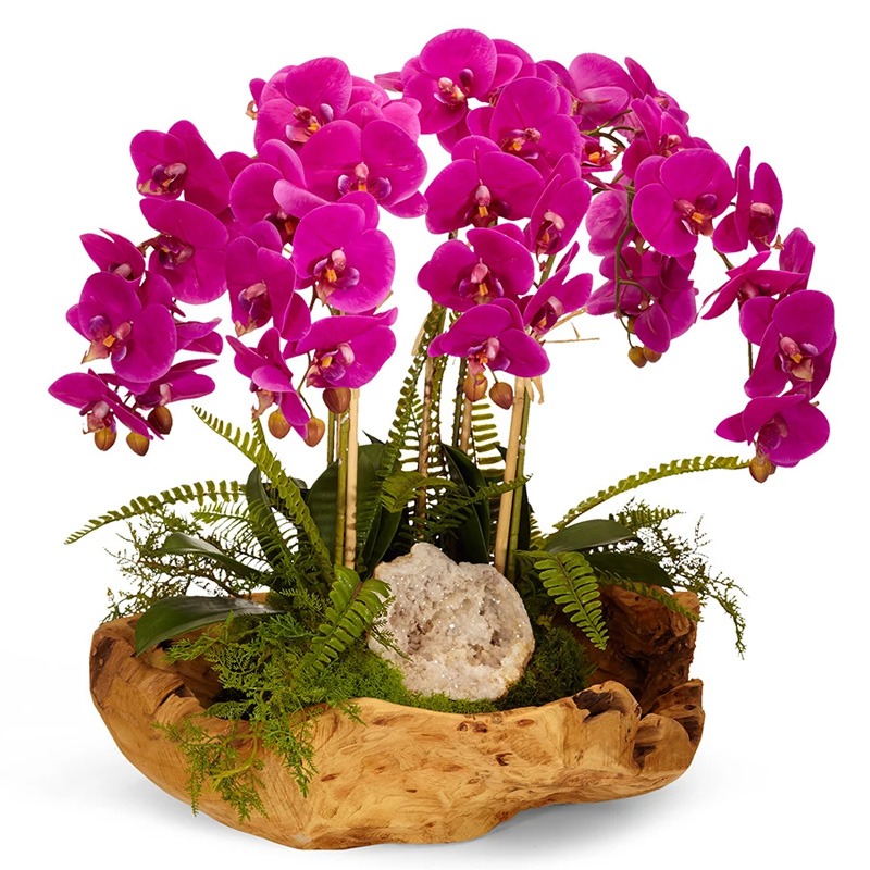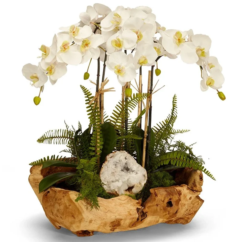 Orchids gathered into a hand-carved wood bowl, finished with various greenery and a substantial piece of crystal quartz geode.