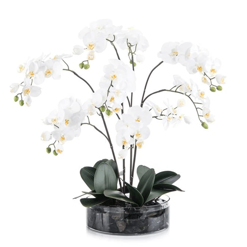 Elegant white phalaenopsis orchids on a bed of natural black river rock in a low-sided round vase with foliage and faux water.