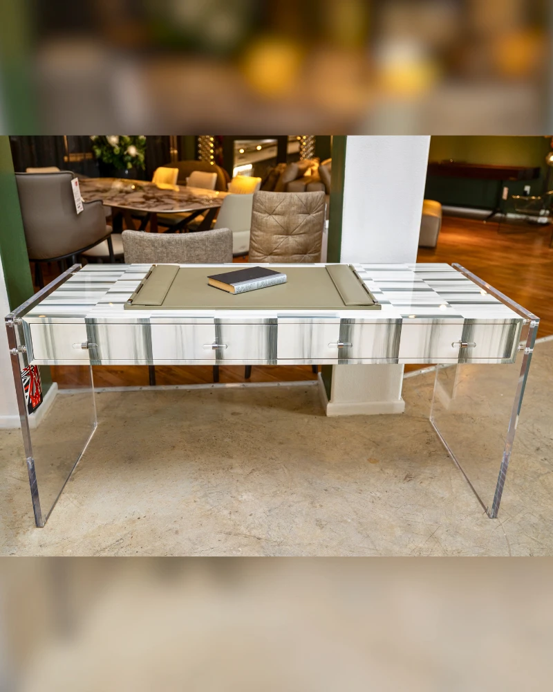 The Quadrilateral Desk by Theodore Alexander is an avant-garde piece of furniture that combines a sleek, mirrored surface with a transparent, lucite frame, creating a floating illusion that’s both stylish and functional for modern workspaces.