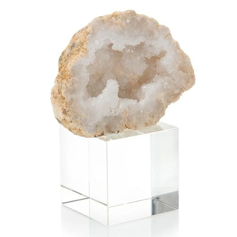 A beautiful natural geode has been split to showcase the crystals within its center. The Split Geode is mounted on a lead-free crystal cube.