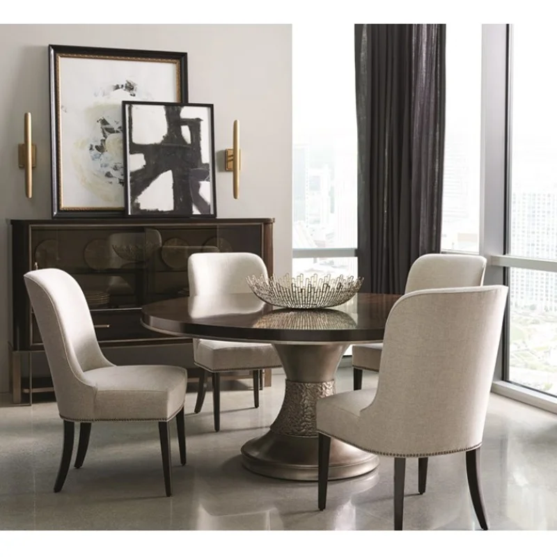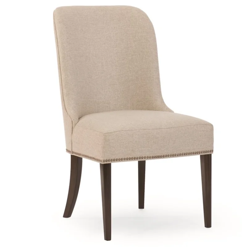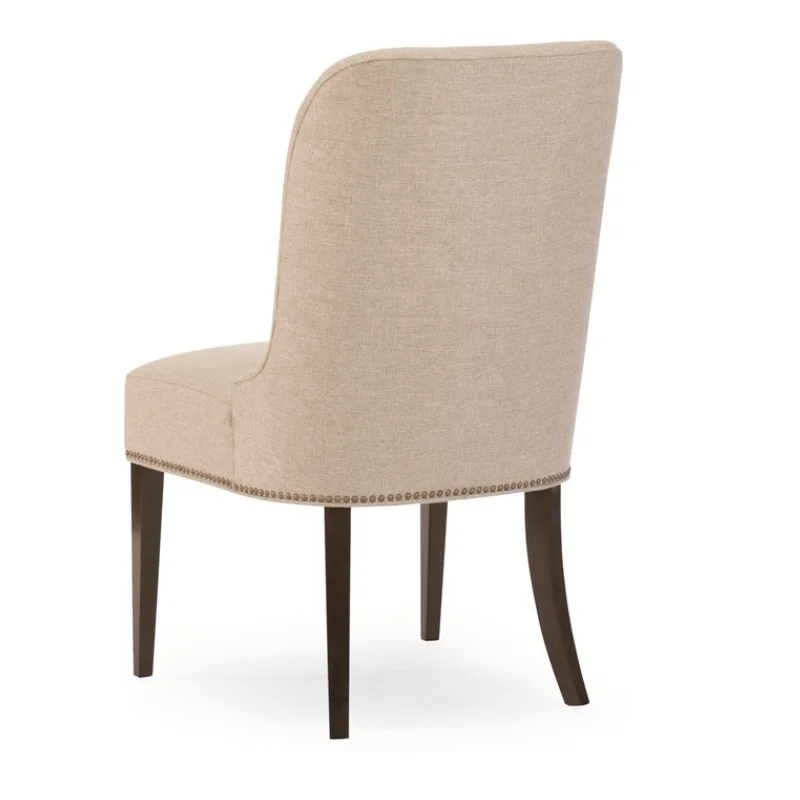 For a clean, classic look around modern or transitional dining tables, the Streamline Side Chair is hard to beat. Fully upholstered in neutral fabric, the chair has tapered sabre wood legs that are finished in Bourbon Glaze to a high sheen. Its tight seat is completed with a band of brass nails at the base.