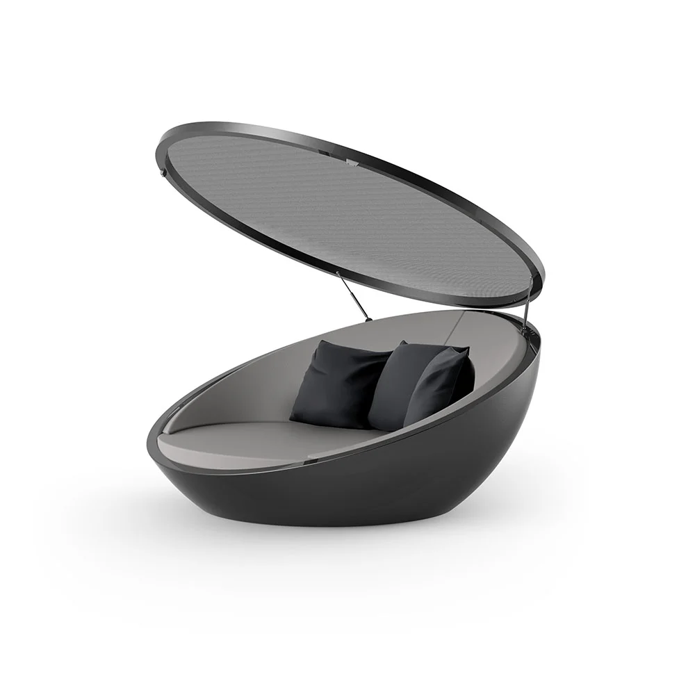 Enjoy shaded relaxation on the Ulm Daybed with Folding Canopy. This luxurious daybed features the collection’s signature smooth form and an integrated canopy for adjustable shade, perfect for sophisticated outdoor lounging.
