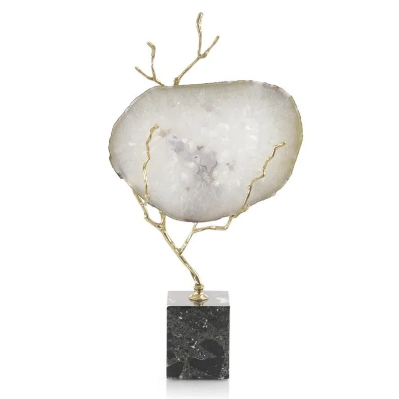 A grand, semitransparent slice of agate is held in a hand-cast brass branch mounted on a marble base in grey and white.