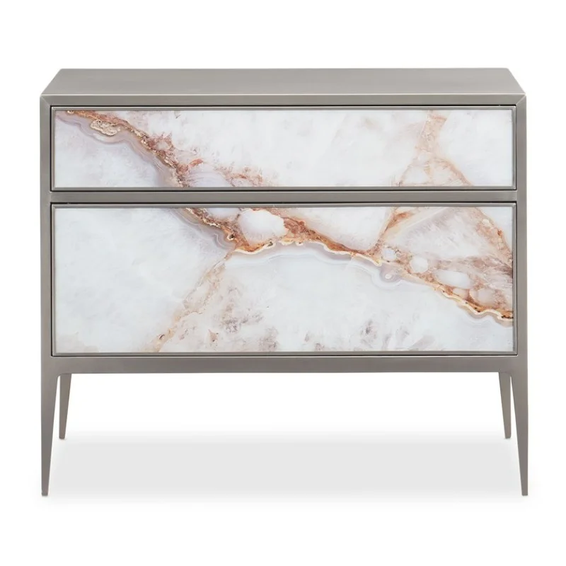 When it comes to an inspired design choice, this chest is A Real Gem. Its distinctive look draws upon the beauty of natural stone’s perfectly imperfect shapes and forms. Each of its two glass drawer fronts feature an exquisitely painted agate pattern that brings the beauty of the outdoors to the inside. A clean-lined, understated metal frame allows the beauty of the agate pattern to enjoy the limelight while slim, tapered legs complete the look.