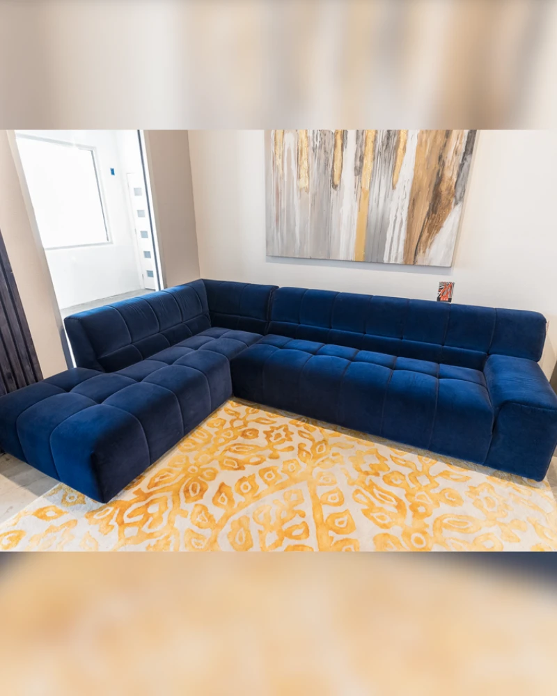 This L-shaped sectional sofa features a modern design with luxurious tufted back and seat cushions. The deep navy blue plush velvet upholstery adds elegance and comfort. Its substantial size and clean lines make it a statement piece suitable for spacious living areas, offering both style and comfort with a modern aesthetic.