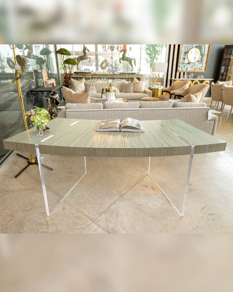 The Clichy Desk by John Richard is a modern office statement piece, combining a striking geometric-patterned top with sleek, transparent legs for a contemporary floating effect. Its large surface provides ample workspace while maintaining a look of sophistication and style.