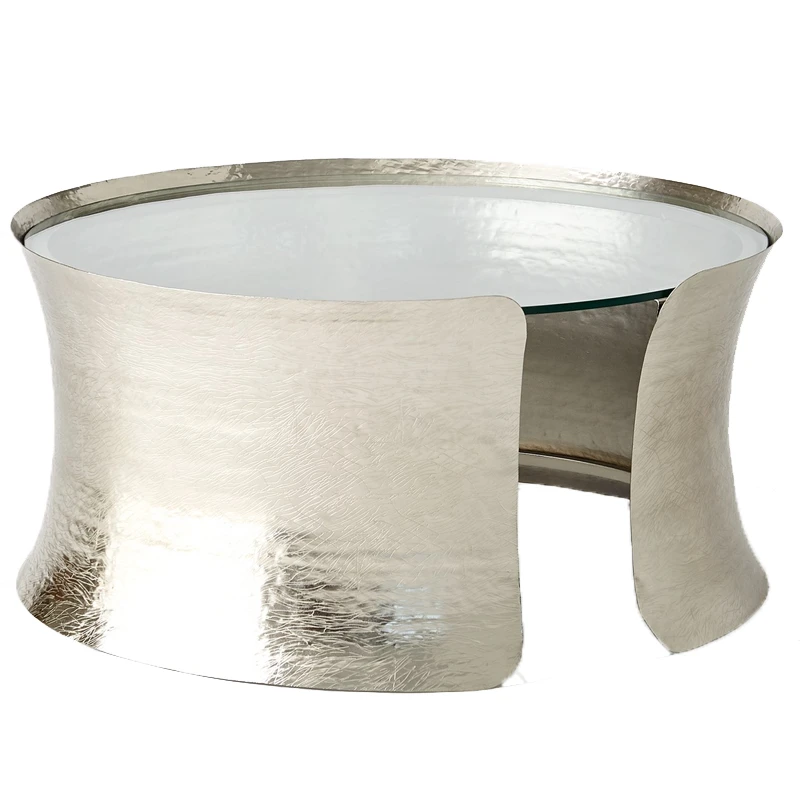 Cuff cocktail table is inspired by your favorite basic wrist cuff. This scratched texture nickel plated table is jewelry for your room. Tempered glass top. Adjustable glides