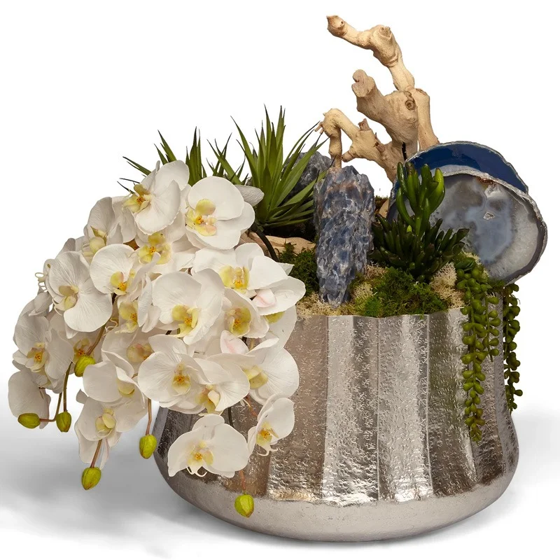 This arrangement features white Phalaenopsis Orchids in a waterfall design and is fit perfectly into a metal container that is filled with chunks of stones, agate slabs, and choice succulents along with preserved moss!
