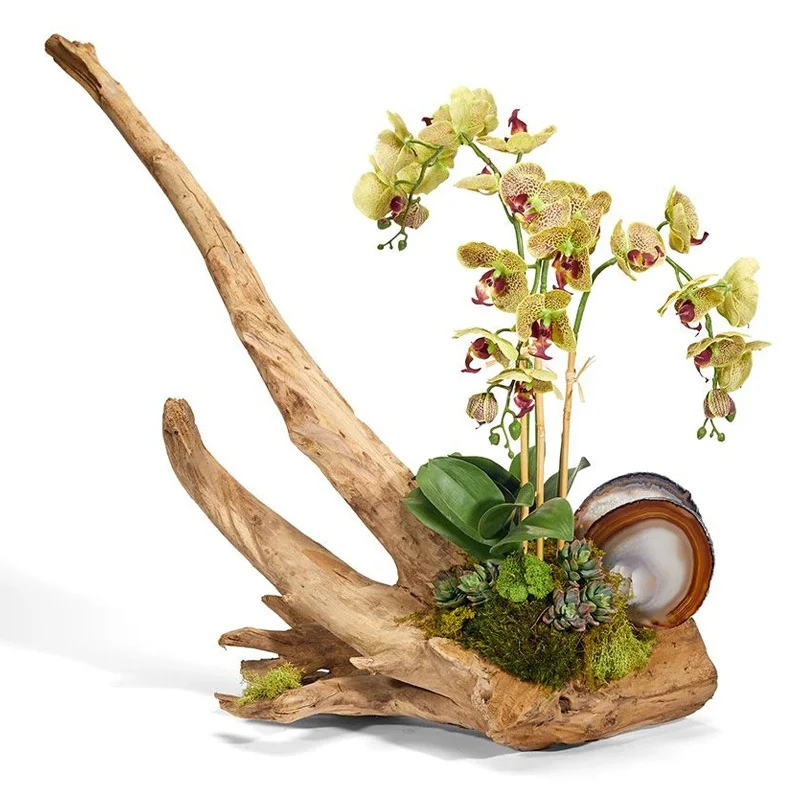 Phalaenopsis orchids balanced on a beautiful piece of unique driftwood. Embellished with agate slabs, succulents, and soft supple preserved moss.