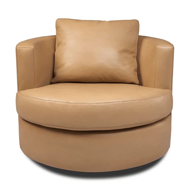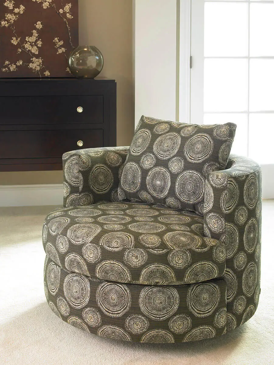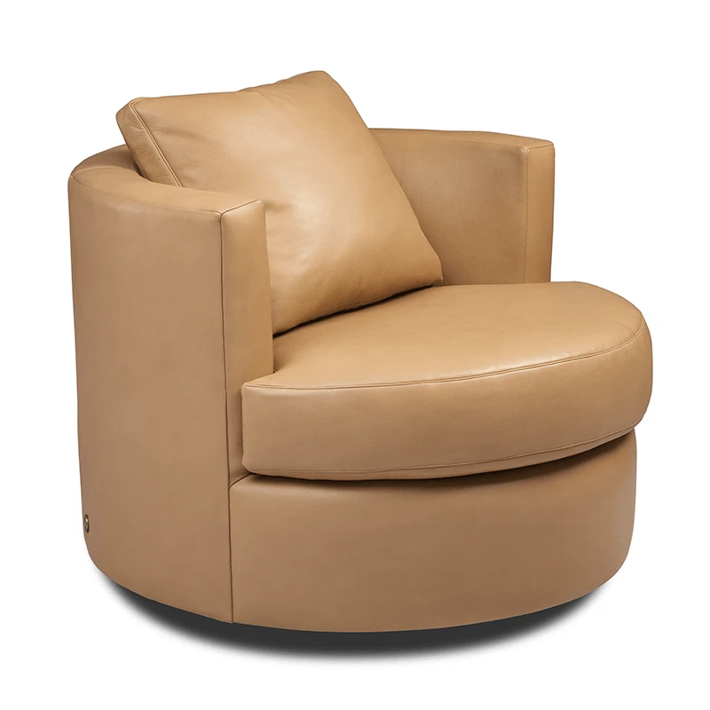 This small-scale swivel chair with a half-circle back and a loose back cushion proves nearly irresistible, thanks to its seating comfort and curvaceous good looks. The memory swivel returns the chair to center. An ideal addition for conversations, parties and everyday relaxation. Options include an extra firm seat, a down seat and contrasting seat and back.