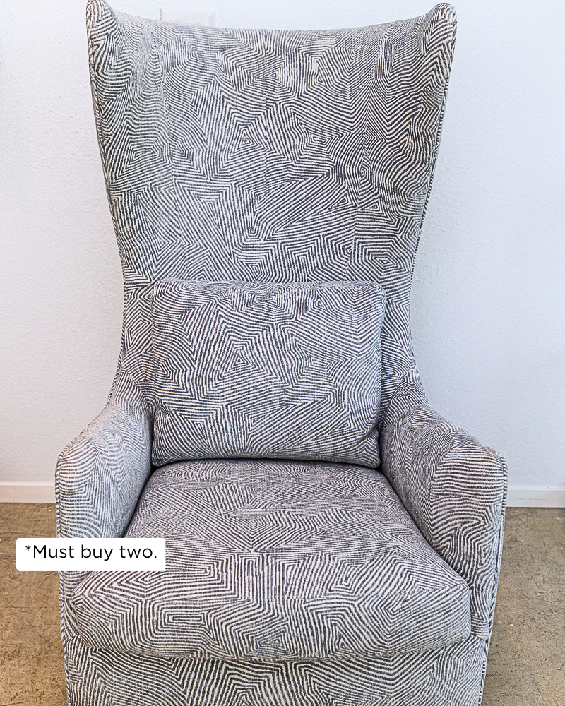 This is an eye-catching, high-back chair by Thayer Coggin featuring a distinctive geometric pattern. The chair’s fabric has a maze-like design in monochromatic tones, offering both visual interest and a tactile experience. The chair’s ample proportions promise comfort, with a high back and deep seat cushion, perfect for lounging.