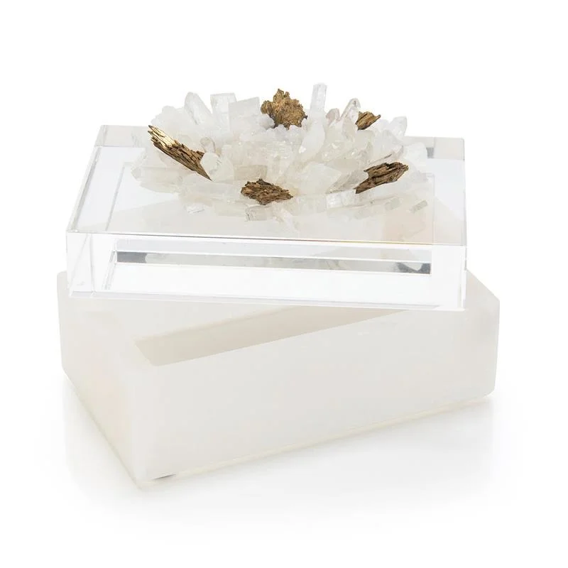 An amazing collection of quartz crystals, tourmaline, and calcite adorns the crystal lid of this lovely alabaster box.