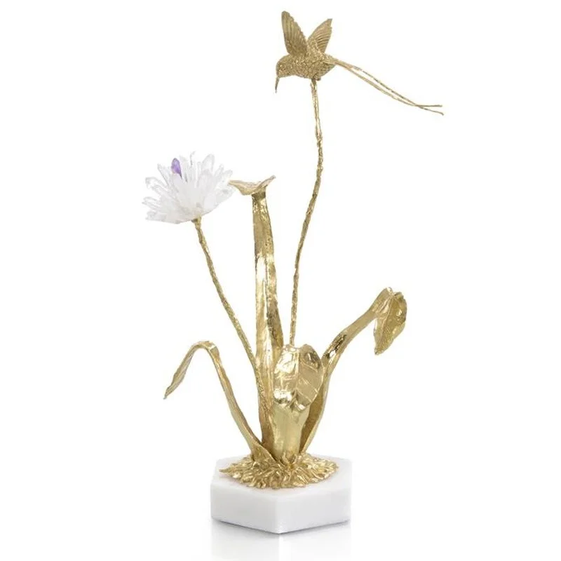 This sculpture features a quartz flower blooming from its leafy brass plant, while a hummingbird hovers above.
