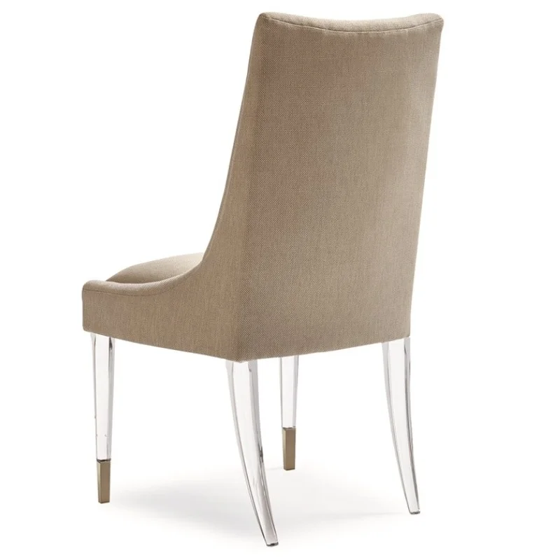 Settle into the soft curve of the upholstered back and seat of this oh-so-comfortable dining chair. This tall, sling-back chair is upholstered in a woven taupe linen fabric that offers a neutral palette to easily mix into any decor. You and your guests can float thru dinner suspended on thin, clear acrylic legs accented with Whisper of Gold metal ferrules. This chair is a natural selection for rooms that need a breath of fresh air.