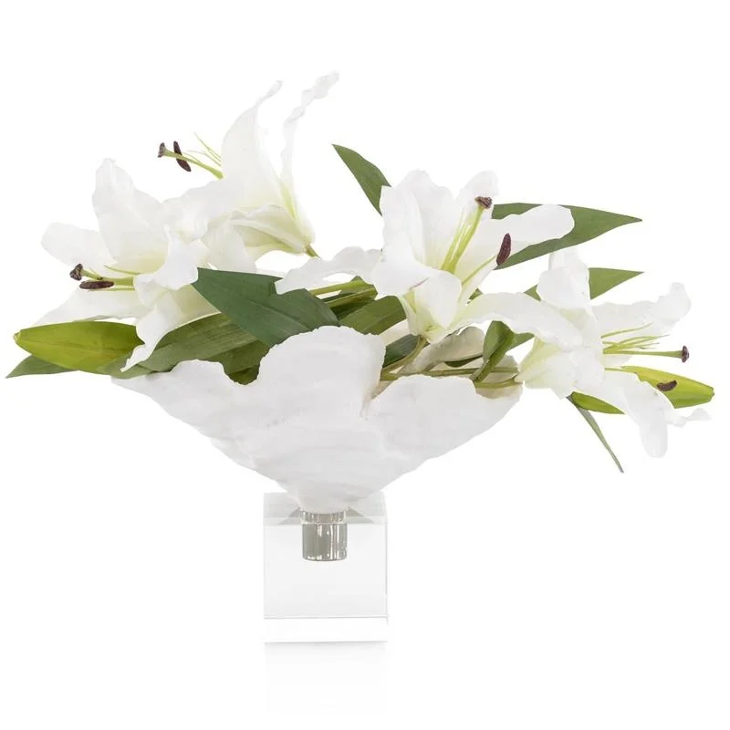 White Asiatic lilies fill a faux coral bowl on a clear pedestal with faux water.