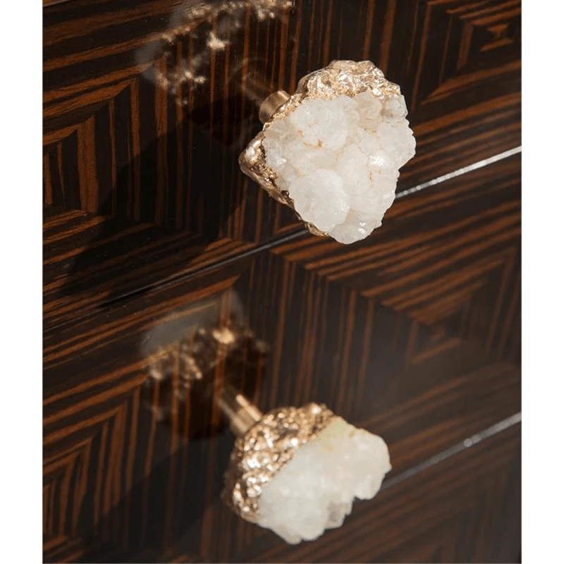 Each of the three graduated drawer fronts are veneered in ebony with a linear pattern of four squares, and they feature silvered crystal handles. The carcass is also veneered in ebony.