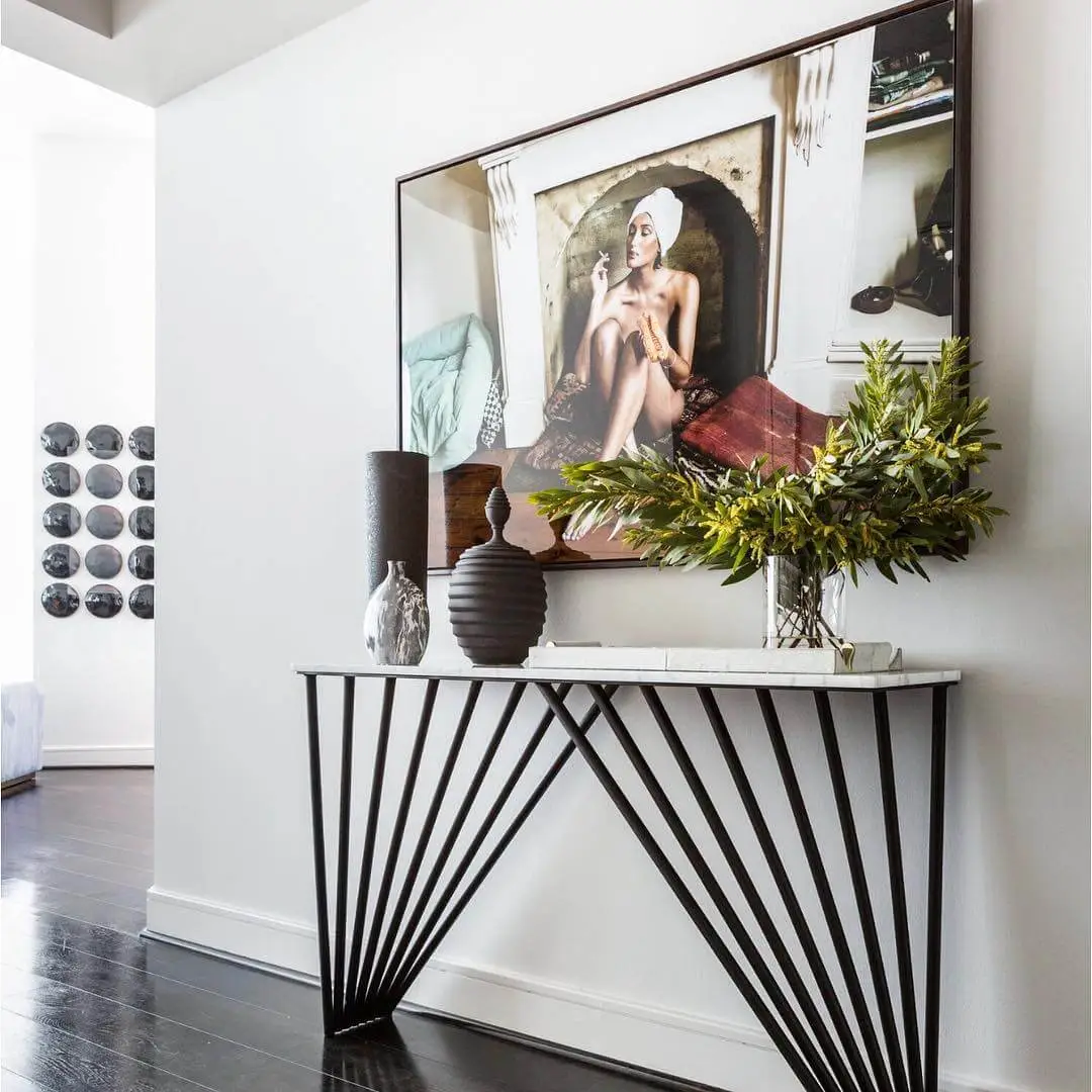 Ornament a hallway with the Marcel Console Table, a strongly angled statement piece featuring a smooth stone top set atop a bronze metal finished base.