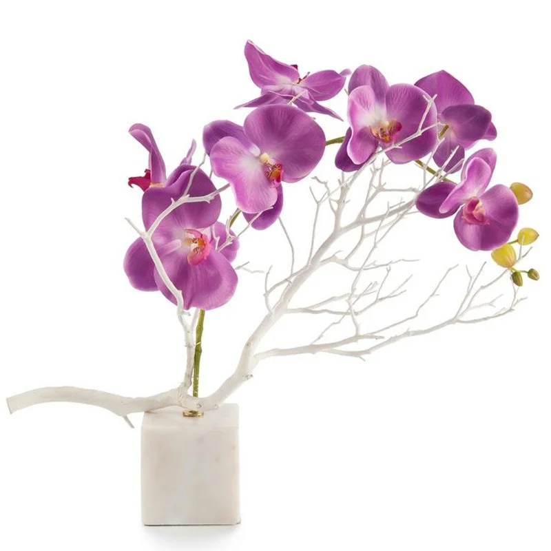 A stylized marble base with an Asian orchid and a natural California manzanita branch.