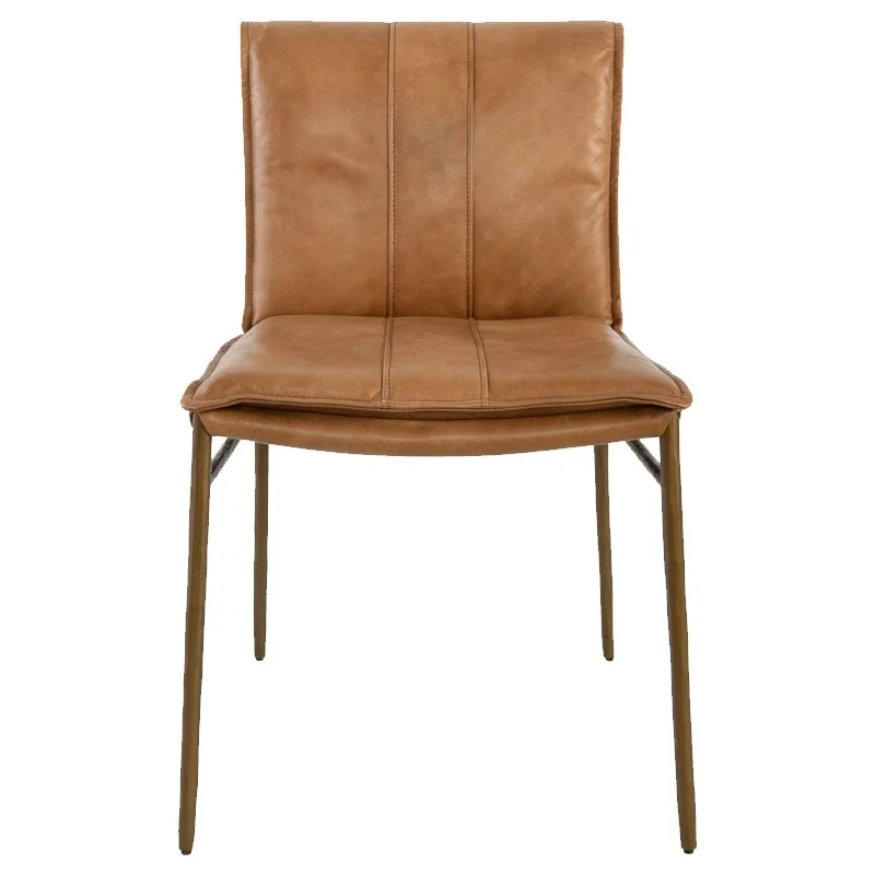 This minimalist dining chair features supple tan leather upholstery and hammered iron legs.