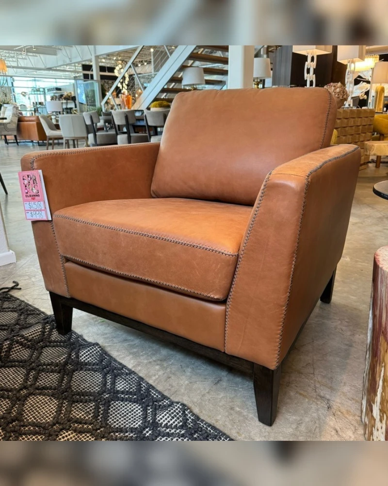 The Moccasin Stitch chair features a warm caramel leather with a distinctive stitch detail, offering both comfort and rustic charm. Its sturdy wood legs and generous cushioning provide a cozy seating option for any space.