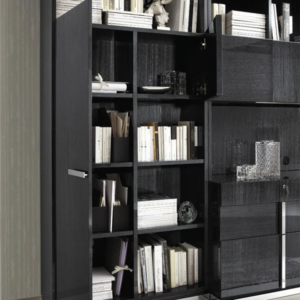 4 shelves, one small cabinet, large cabinet with shelves. Chrome accents