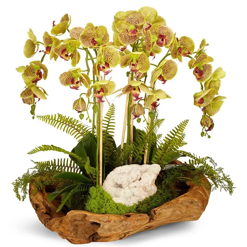 Orchids gathered into a hand-carved wood bowl, finished with various greenery and a substantial piece of crystal quartz geode.