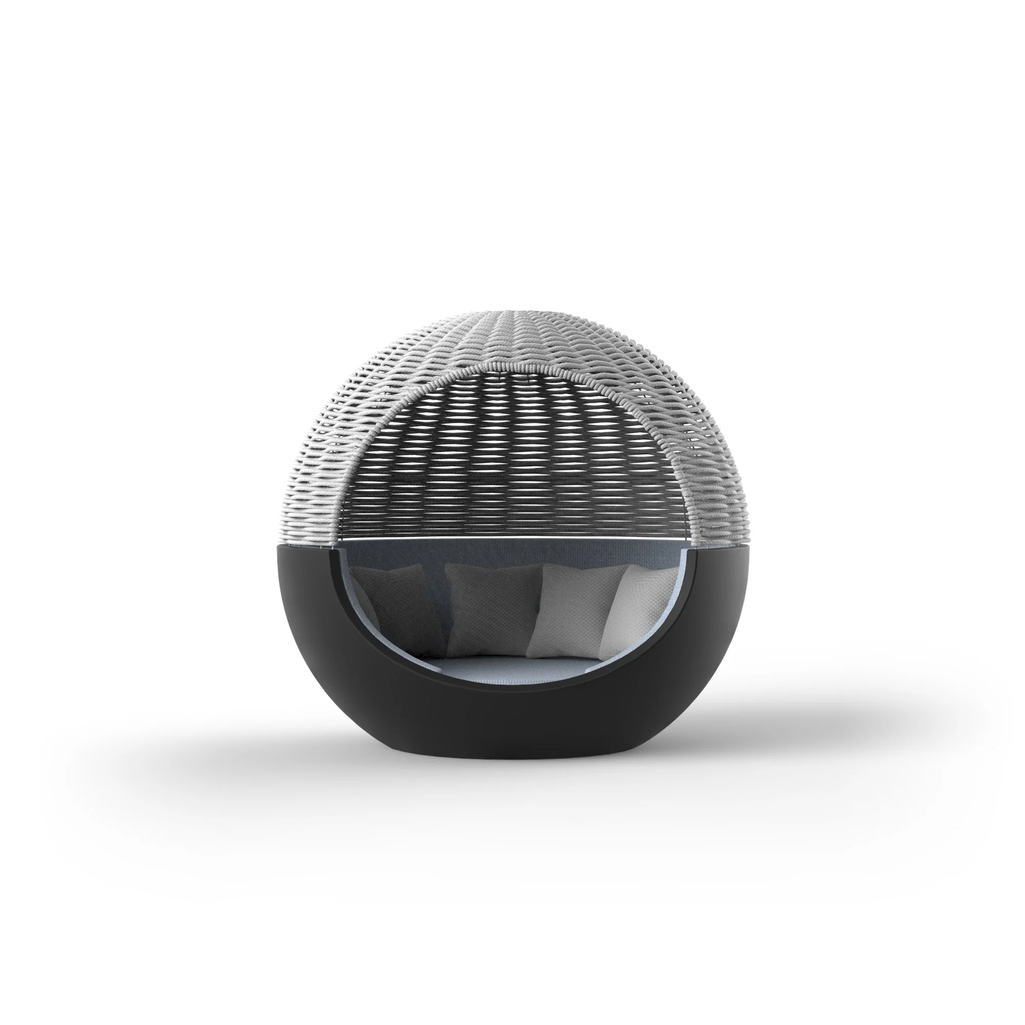 Create a unique outdoor oasis with the Ulm Moon Daybed featuring a Woven Rope Parasol. Its distinctive circular form and integrated, textured canopy provide a luxurious and artful spot for shaded relaxation in sophisticated contemporary style.