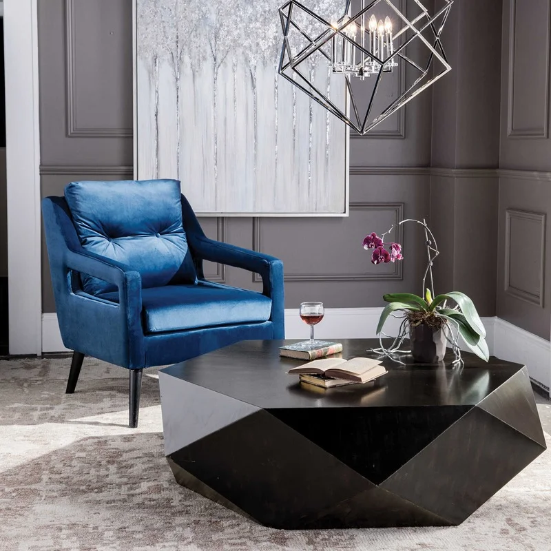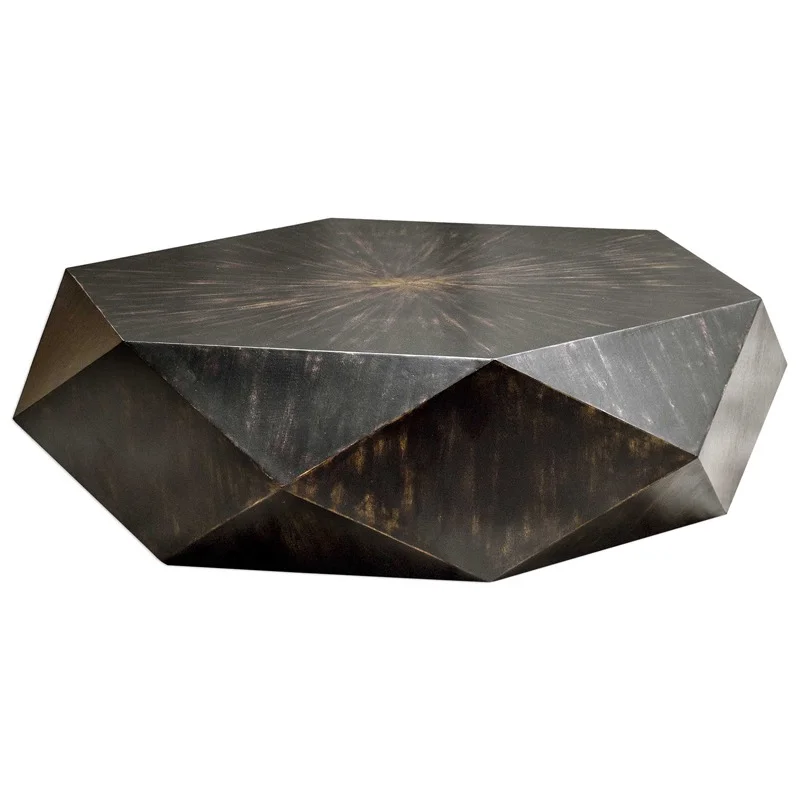 This unique geometric table features a low profile, perfect for viewing the sunburst top in mango veneer with a worn black finish with natural distressing, rubbed to reveal honey undertones.