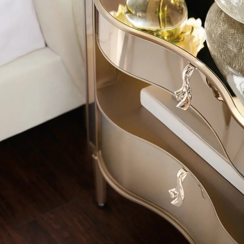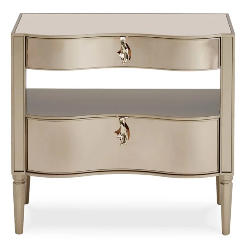 A shapely beauty, this bedside table conveys modern sophistication. Place it next to any bed to elevate the design of the room. Its curvy silhouette is finished in Golden Shimmer and accented with a bronze mirrored top, end panels and post overlays. Open in the middle, it features two drawers for essentials accented with sparkling jewelry-like pulls that add an element of chic glamour.